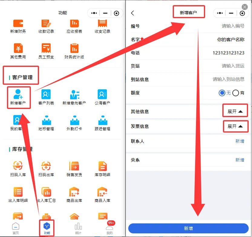 【功能】->在【客户管理】找到“新增客户”图标->点击进入“新增客户”页面即可添加客户。
