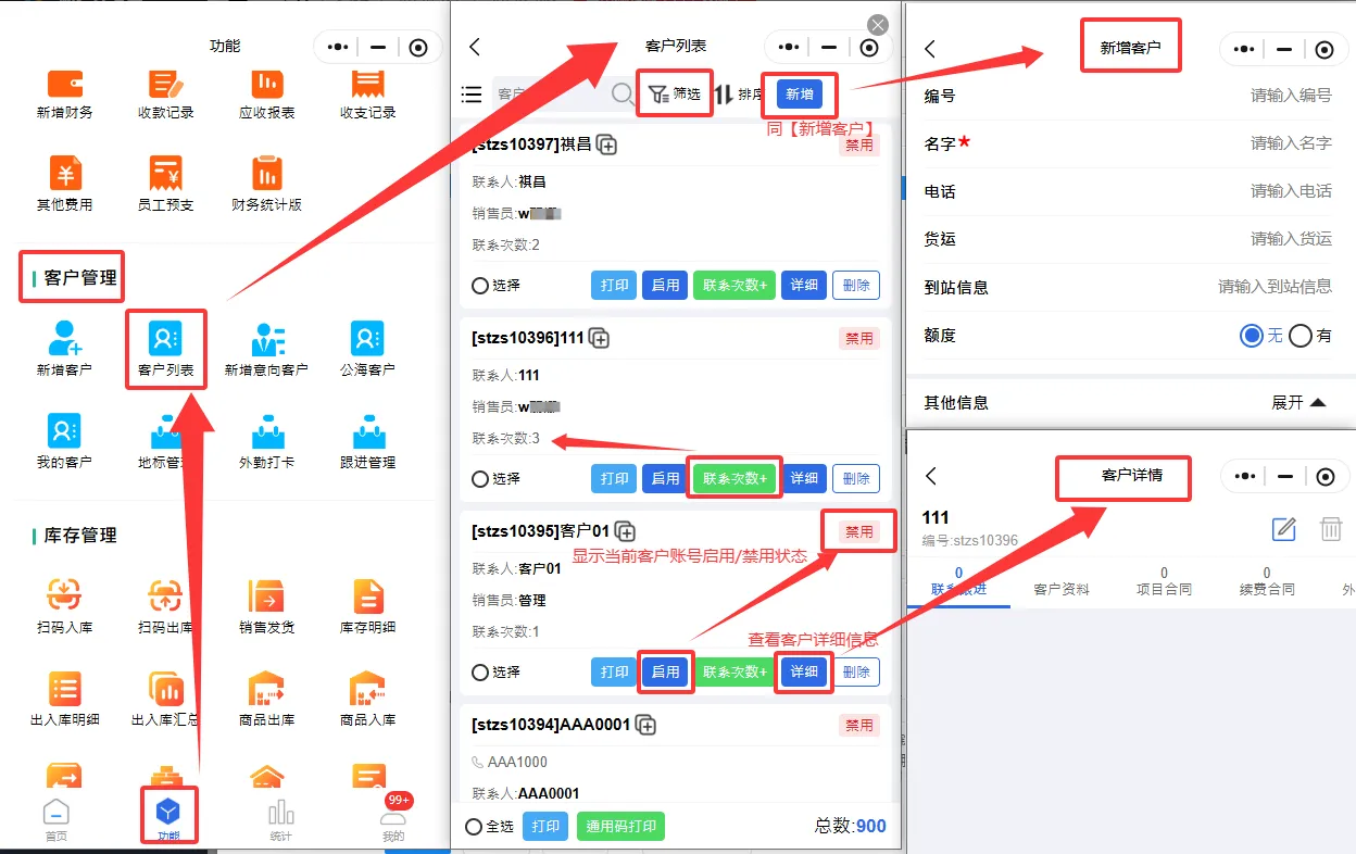 【功能】->在【客户管理】找到“客户列表”图标->点击进入“客户列表”页面即可新增客户、禁用\启用客户、查看客户详细、删除客户。