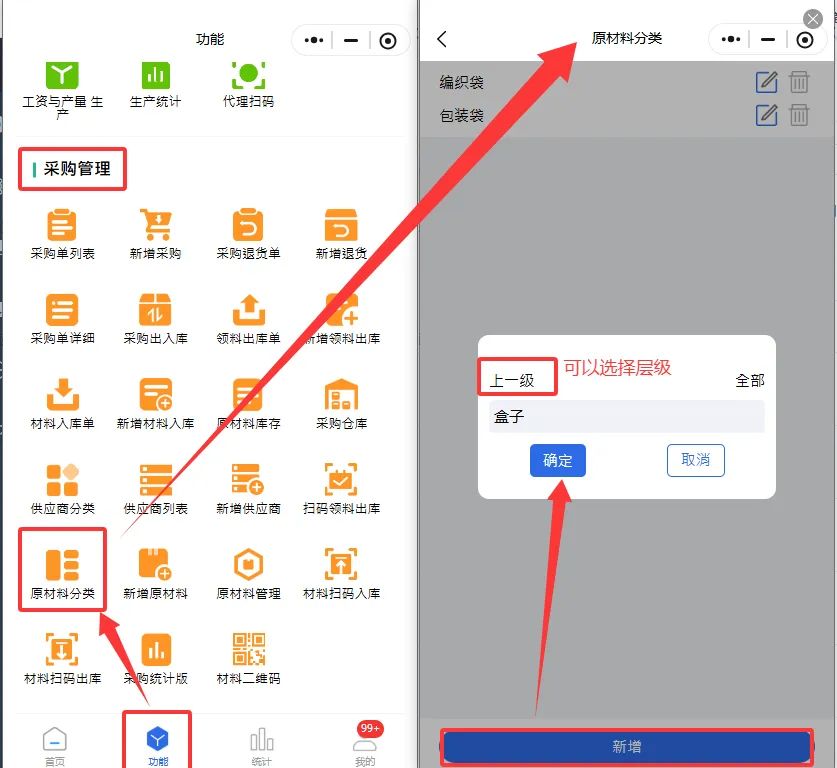 【功能】->在【采购管理】中找到“原材料分类”,新增、编辑、删除原材料分类,可设置原材料分类的层级。