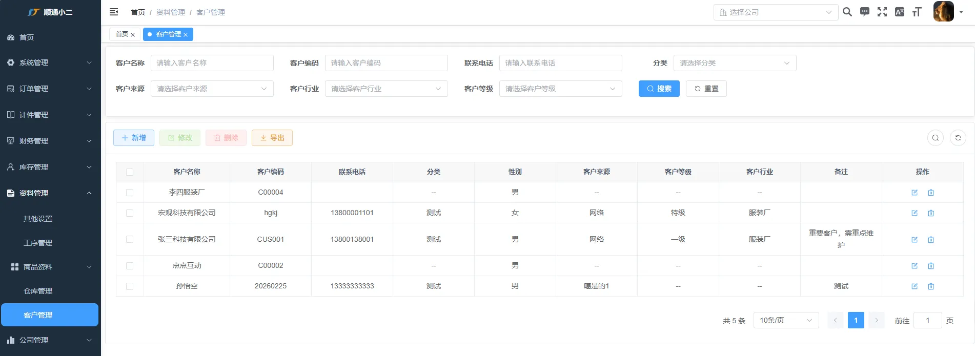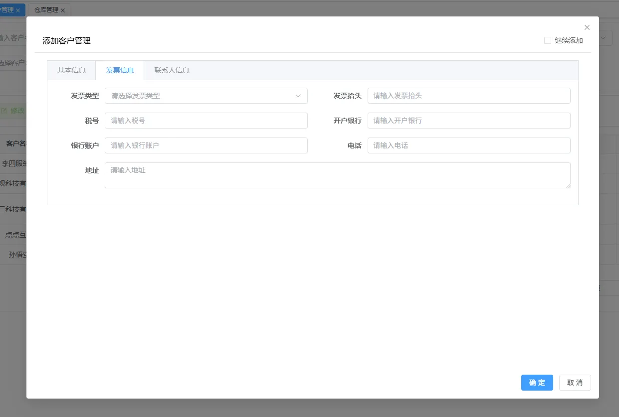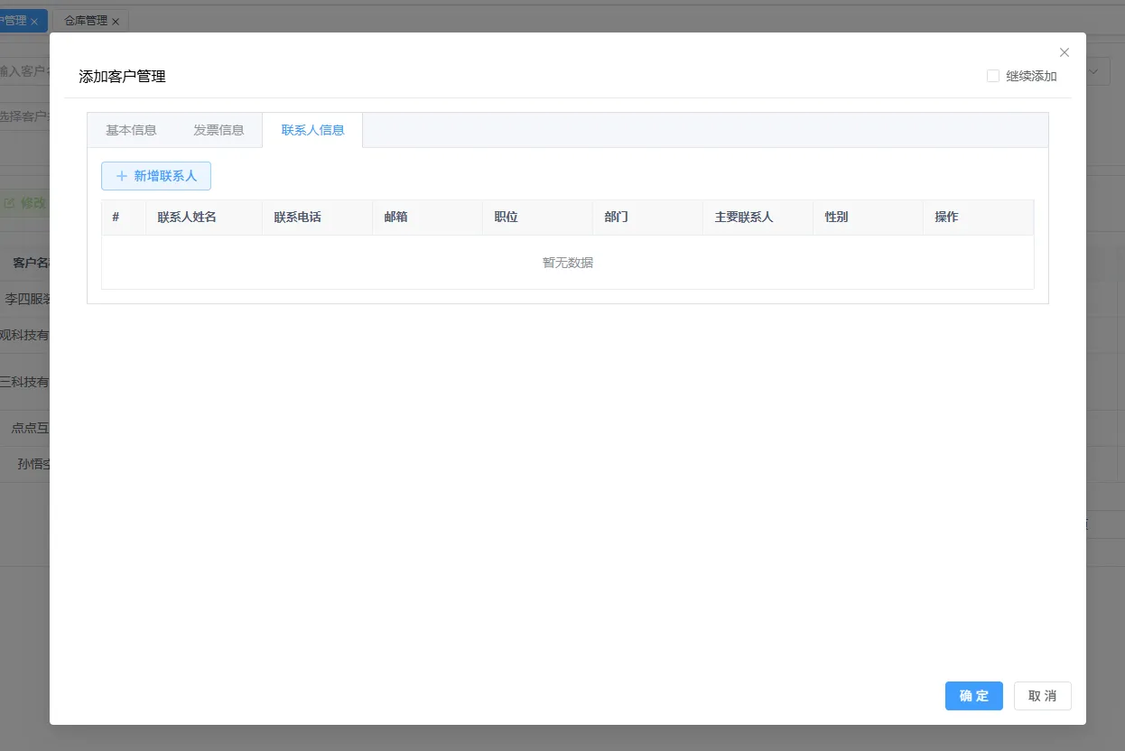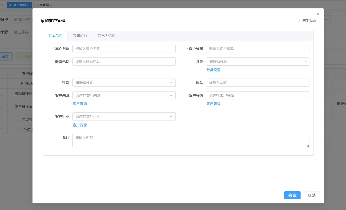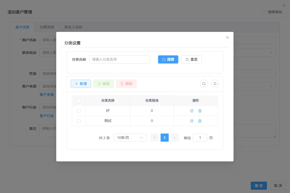 进入客户管理页面,点击新增按钮,跳出弹窗,可以设置客户的基本信息、发票信息、联系人信息在客户信息还可以设置客户的分类,点击“分类设置”可跳出“分类设置”弹窗,对客户的分类进行管理(增删改查)