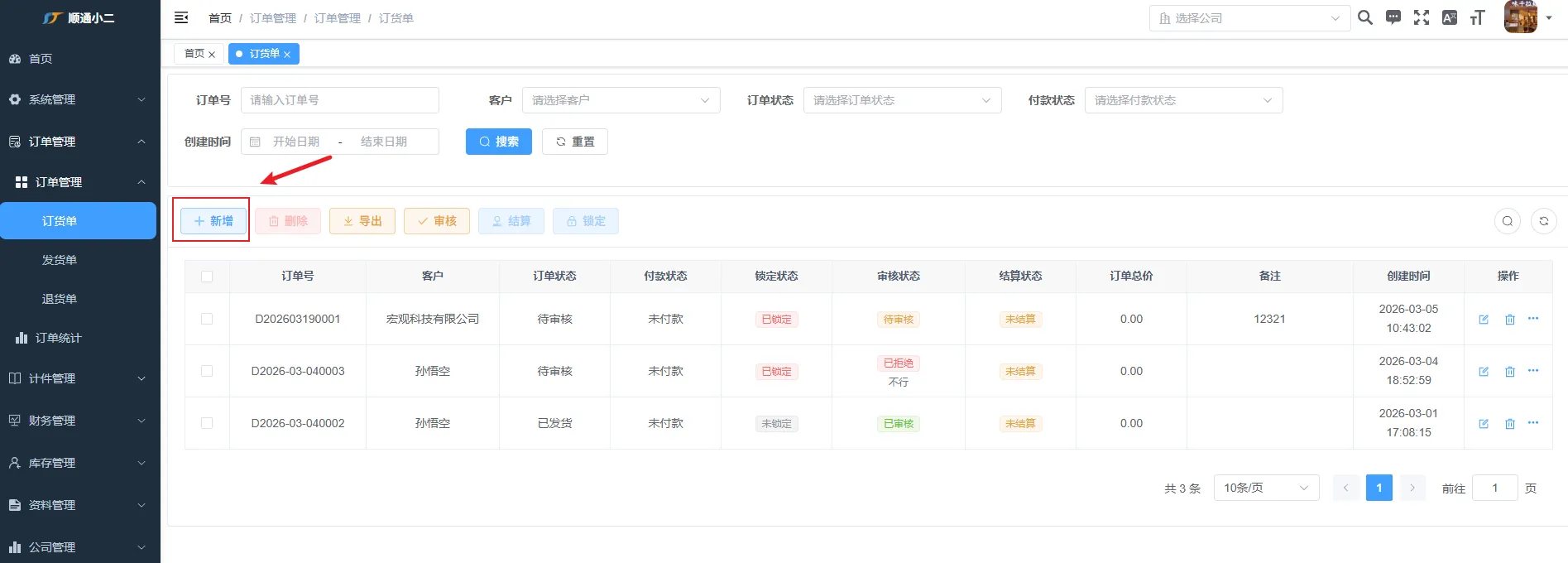 进入“订货单 ”管理页面,点击新增按钮,跳出弹窗
