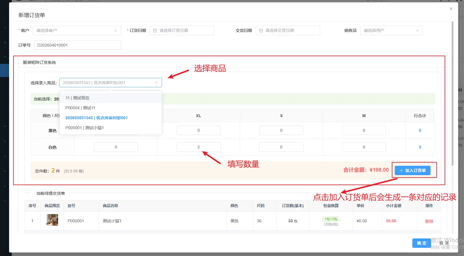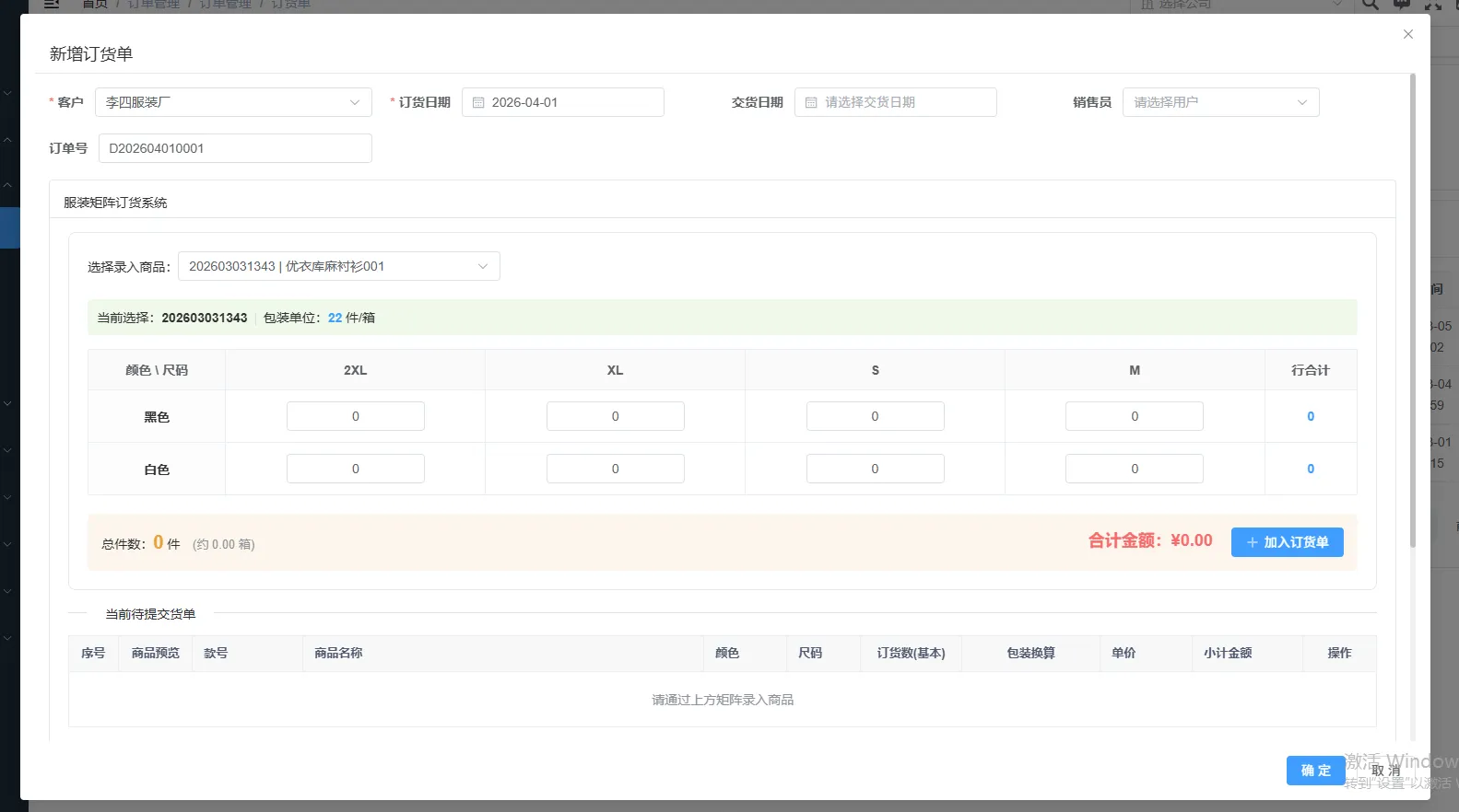 选择订货的商品,填写该商品不同颜色不同尺码的订货数量,点击加入订货单,会生成相应的订货记录