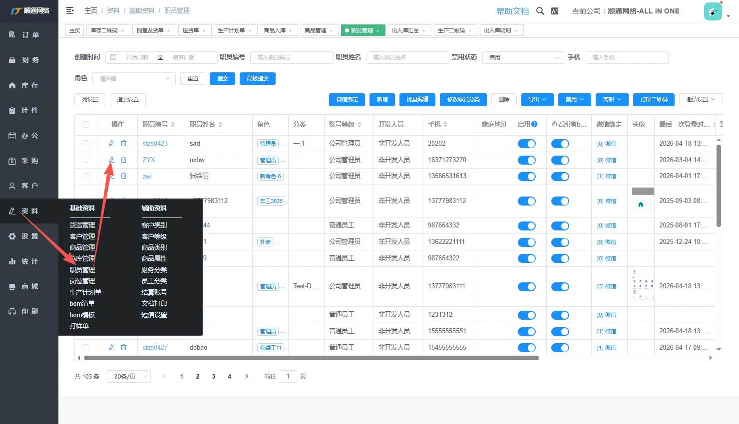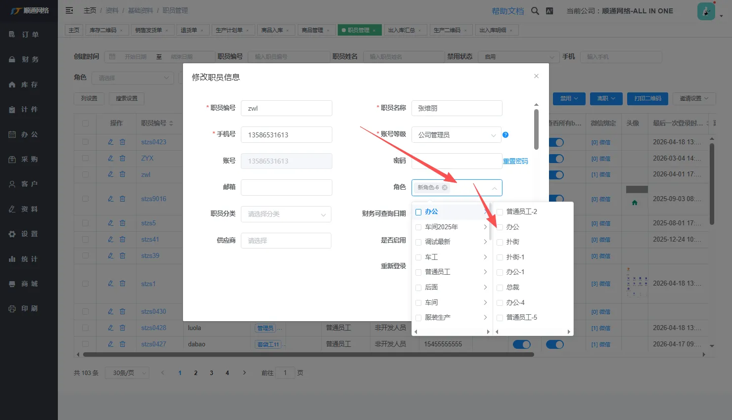 首先找到资料->职员管理对所需要权限的支援进行编辑
