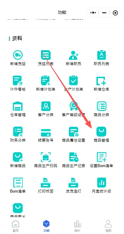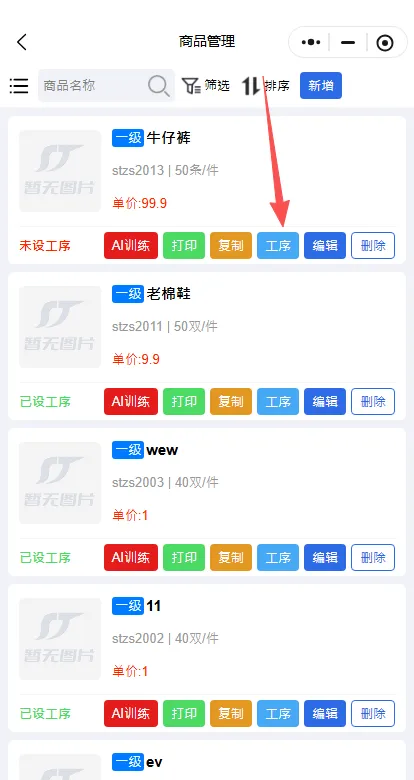 首先找到商品管理,然后找到你所需要添加工序的商品并点击工序