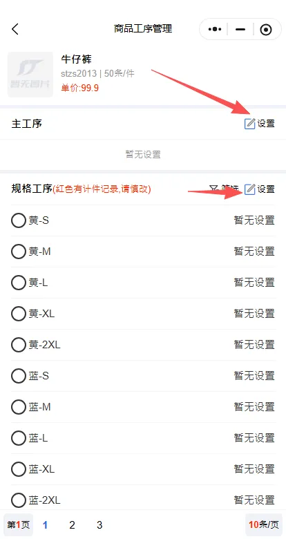 选择主工序,为商品的所有款式添加工序,点击规格工序为特定款式添加工序