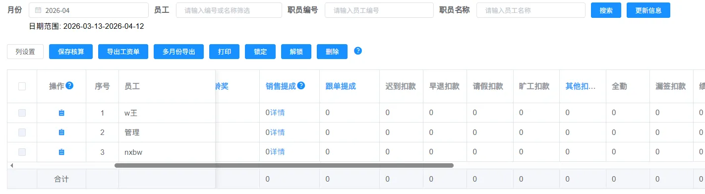 根据节假日管理、审批管理、考勤模板、绩效提成等多方面参数进行工资的统计核算。当修改考勤模板后,需点击更新信息,确认无误后点击保存核算锁定工资。