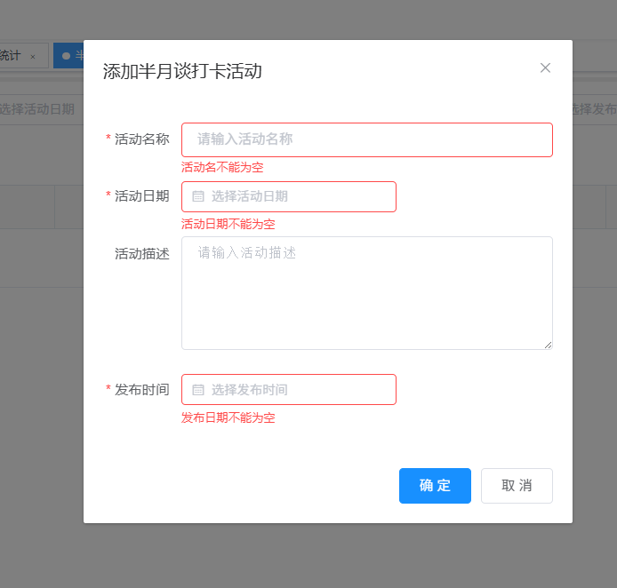 点击新增按钮,跳出新增弹窗,填写活动主题、活动日期、打卡日期、描述(非必填),点击保存,新增成功