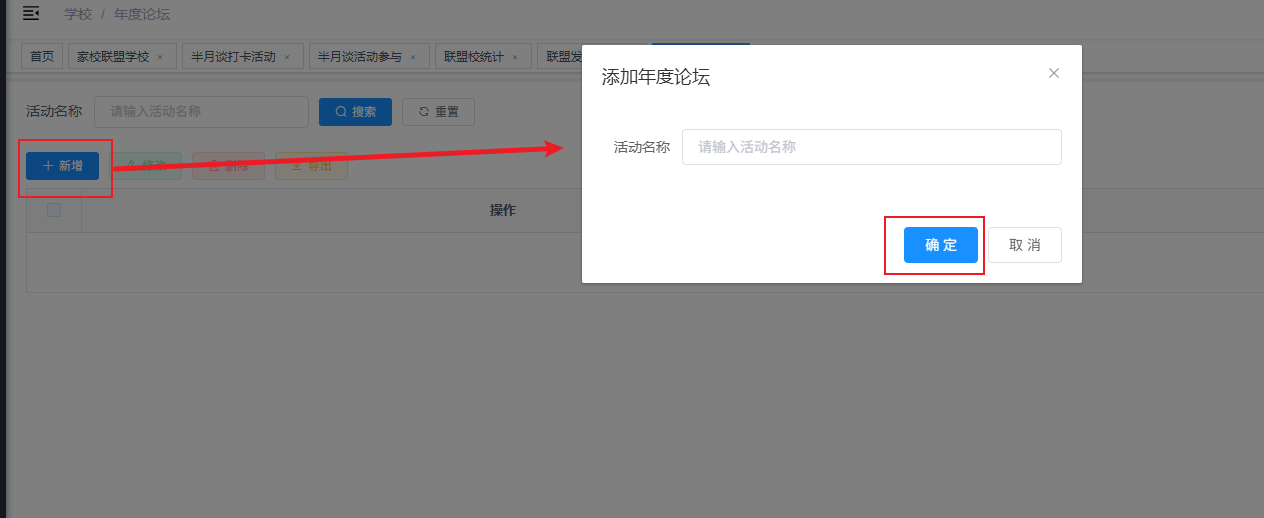 点击新增按钮,跳出新增弹窗,输入活动名称,点击确定,即可新增成功