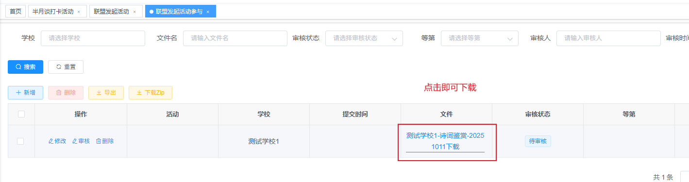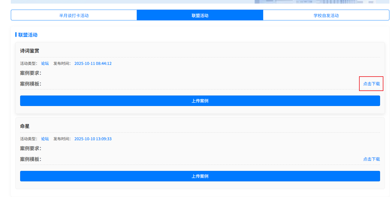 要想参与联盟活动,登陆前台页面,导航栏选择活动,点击联盟活动,找到想要参与的活动,点击下载模版