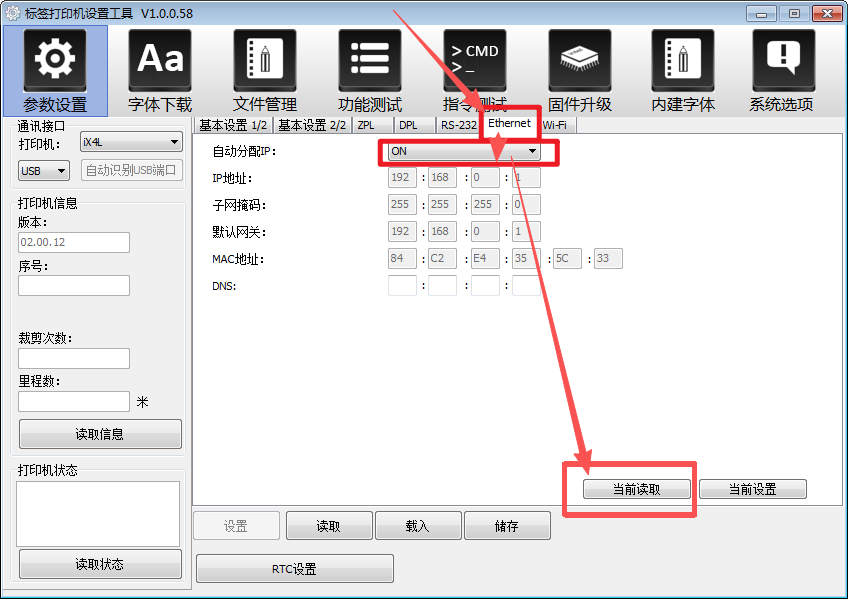 第二步,将打印机的Ethernet中自动分配IP设置为on。