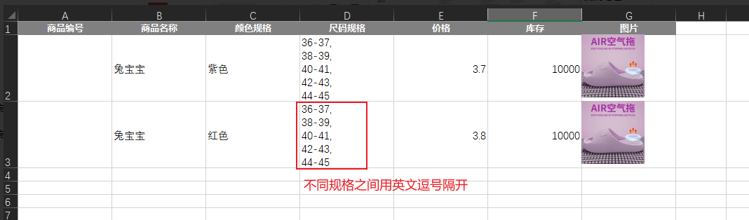 一般来说,商品的规格(如37码,38码)有多种,为了避免同类商品因规格多样是的导入数据冗长,本次更新优化了导入模版,可以使得统种商品的规格变成一条数据导入,具体实现效果如下所示