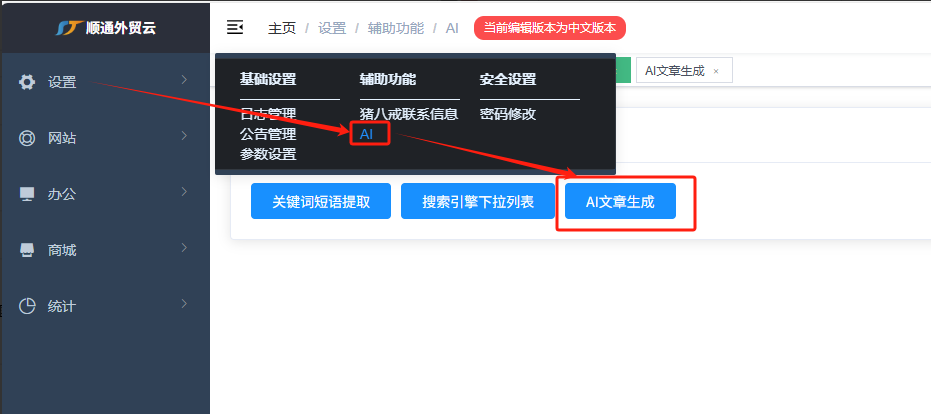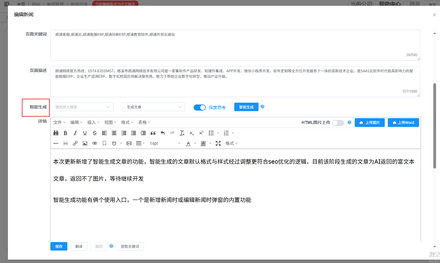 智能生成功能有俩个使用入口,一个是新增新闻时或编辑新闻时弹窗的内置功能