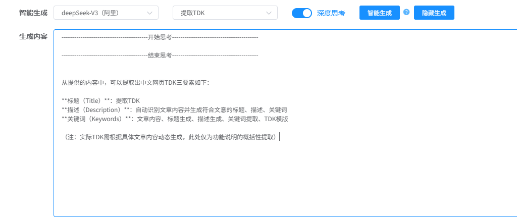 本次更新新增了“提取TDK”的功能,可以自动识别文章内容,并根据文章内容生成符合文意的标题、描述、关键词,不必再人为整理关键词或使用一样的TDK模版