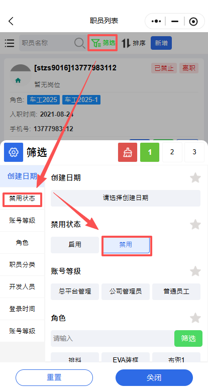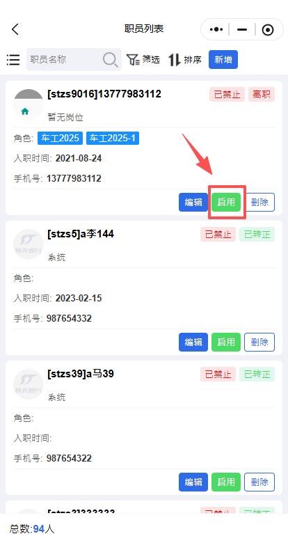 电脑端操作手机端小程序操作筛选被禁用的员工点击启用