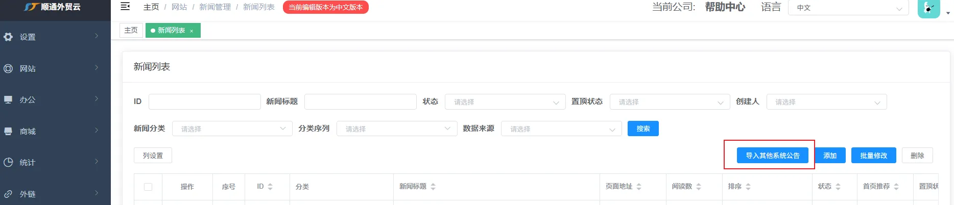 进入新闻列表页面,点击“导入其他系统公告功能 ”按钮