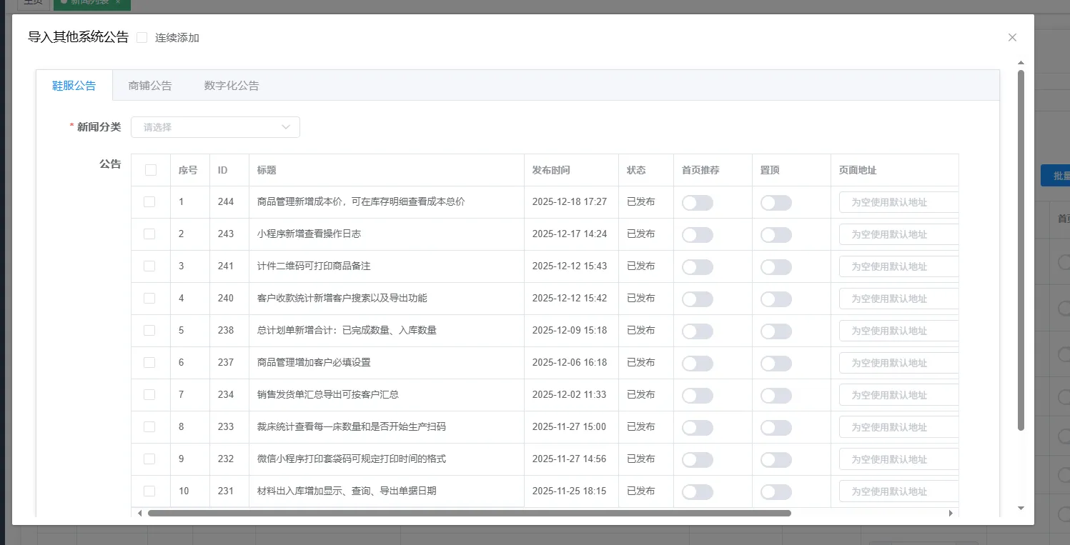 可以选择不同系统(鞋服/商铺/数字化),勾选想要同步的记录,新闻分类一栏选择的是同步过来的记录在外贸云(本系统)的分类所属,选择完毕后点击确定即可导入成功