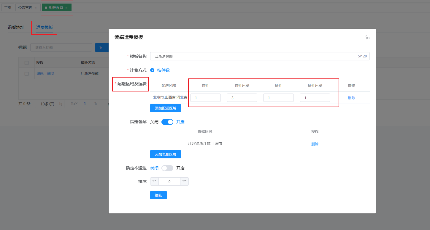 在相关设置中可设置运费模版,目前主要功能在于可以选择针对不同区域设置不同的运费,可以设置首件和续件的件数以及运费
