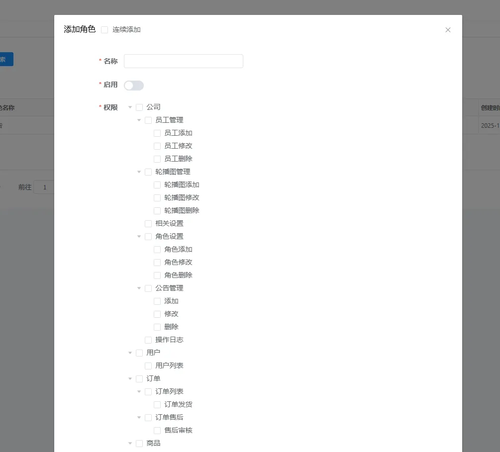 在这个弹窗中可以设置角色的名字,启用或关闭角色,以及设置这一类角色的权限