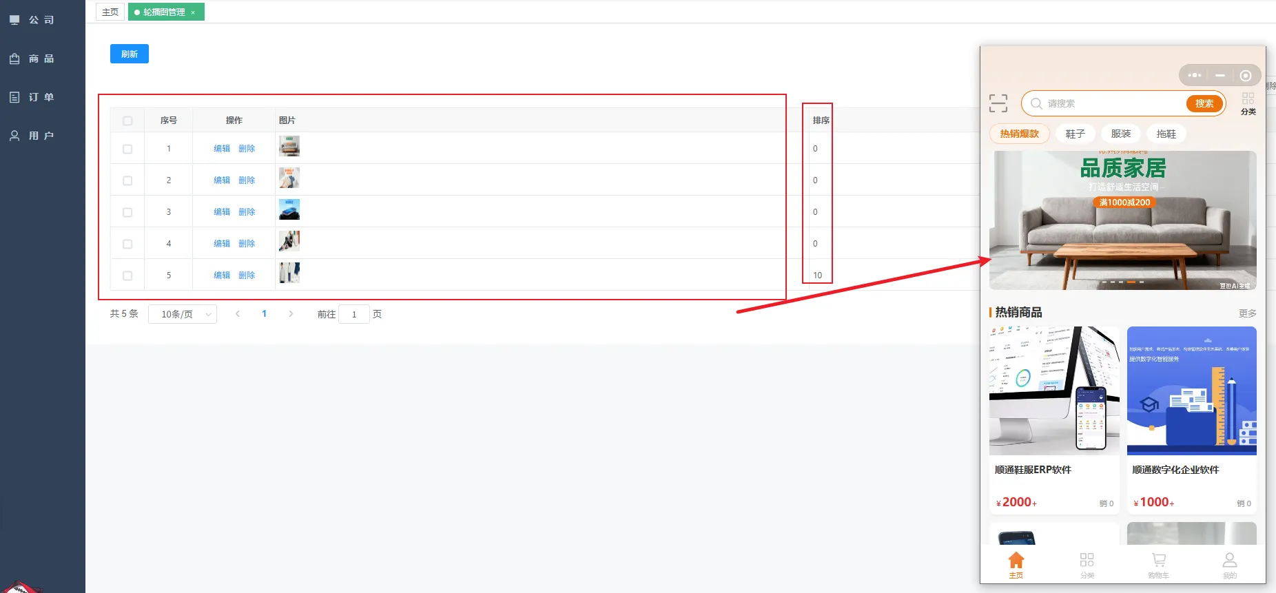 进入轮播图管理页面,在该页面中,可以对商铺小程序页面的轮播图进行设置,此外,也可以对图片进行排序设置