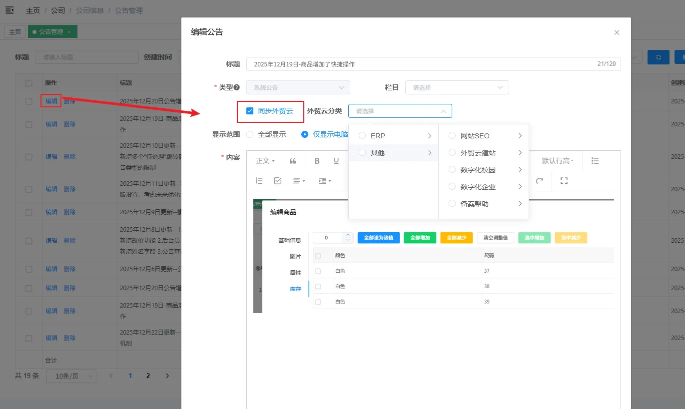 进入公告管理页面,点击编辑按钮,勾选同步外贸云,选择要将该条记录放在外贸云的分类目录,点击确认即可同步成功(目前新闻同步至外贸云的帮助中心)
