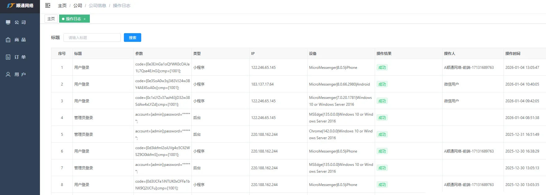 进入操作日志页面,在该页面可以看到所有用户在后台或小程序的操作记录