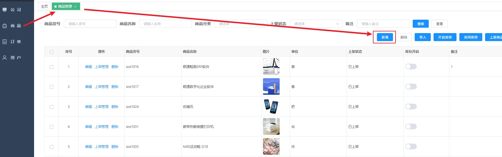 进入商品管理页面,点击新增按钮,跳出弹窗