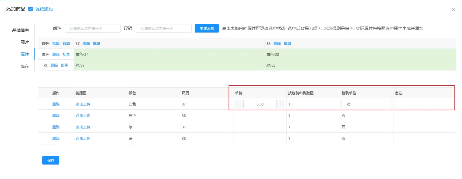 在弹窗下方的记录中,可以针对不同颜色和尺码设置单件、出售数量、包装单位,设置完成后点击保存按钮,即可添加成功