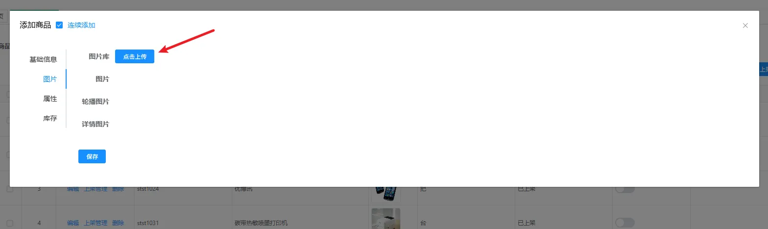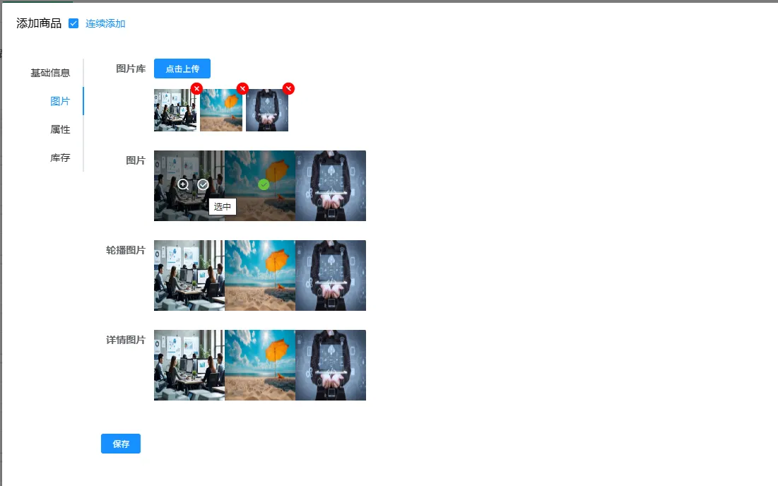 我们将商品的信息分为了四个板块,分别为基础信息、图片、属性、库存,基础信息按字段名称填写即可,图片可以设置商品的展示图、详情图、轮播图等,在添加图片的时候可以先点击图片库右边的点击上传按钮上传所有要用的图片