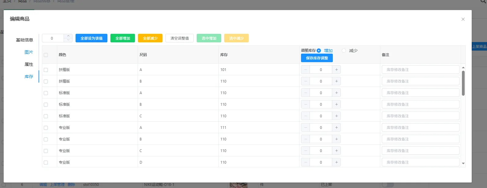 最后是库存类别,该类别在添加完商品后点击编辑重新进入弹窗,可以设置不同规格的商品库存