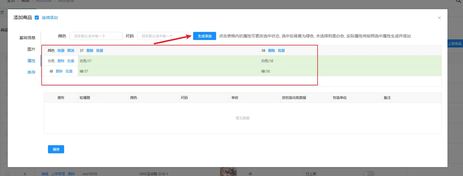 属性类别用于设置商品的颜色和尺码,可以先在颜色和尺码框中选择想要的颜色和尺码(没有的颜色尺码可以手动添加),支持多选,选择完毕后,点击“生成添加”按钮