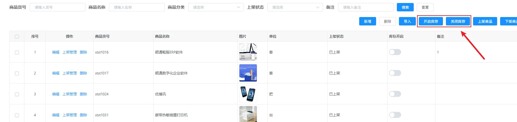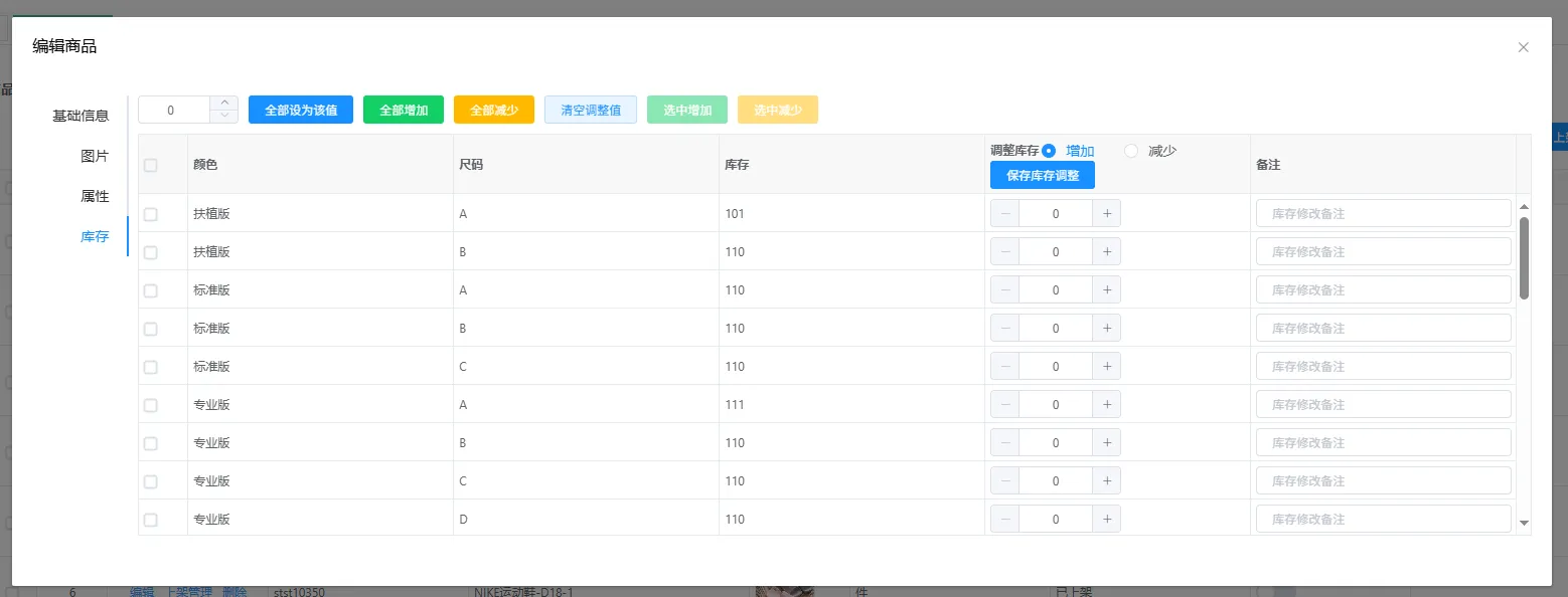 点击操作栏的编辑按钮,选择库存类别在此弹窗可以对批量全部设置、批量全部添加或减少、勾选记录添加或减少等操作此外,还可以在列表右上方点击“开启/关闭库存”按钮进行批量开启/关闭库存操作