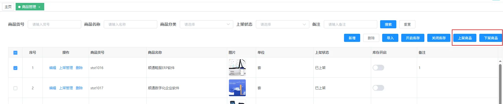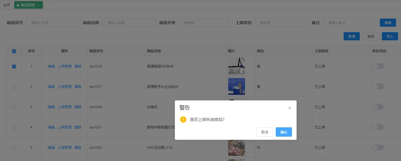 进入商品管理页面,勾选想要上架/下架的商品记录,点击上架/下架商品按钮跳出弹窗,点击确认即可完成对应操作