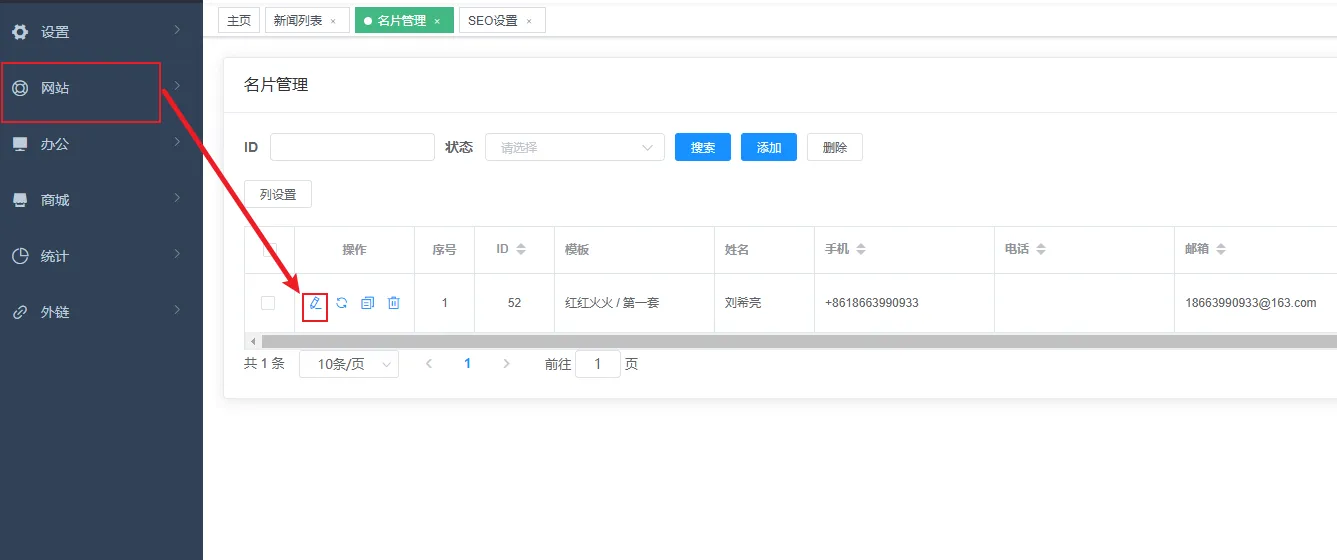 进入名片管理页面,点击修改按钮可以控制名片上地图导航的显示与关闭