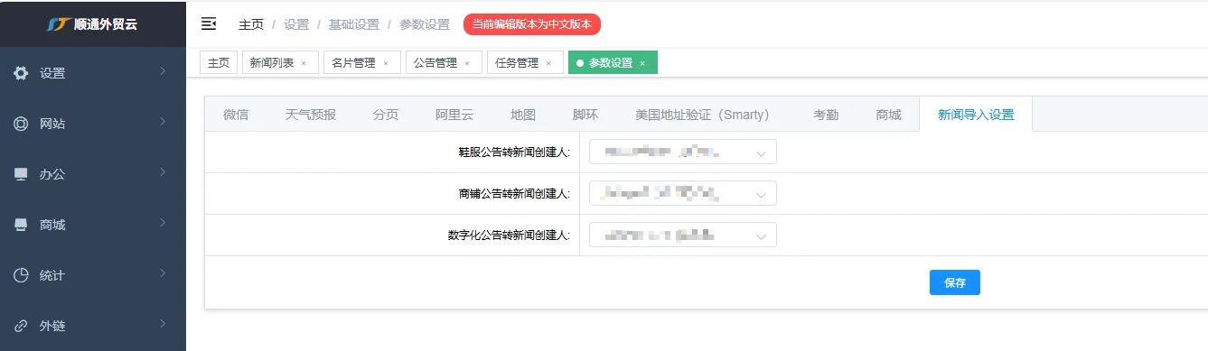 设置-->参数设置-->新闻导入设置,在这个页面可以设置从其他系统导入过来的新闻公告的默认创建人