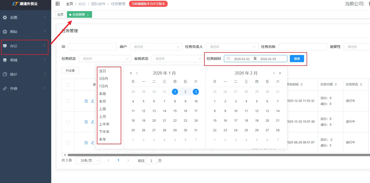 新增时间条件查询,可以设置时间段查询,也可以通过左侧菜单栏选择本周、本月等条件查询