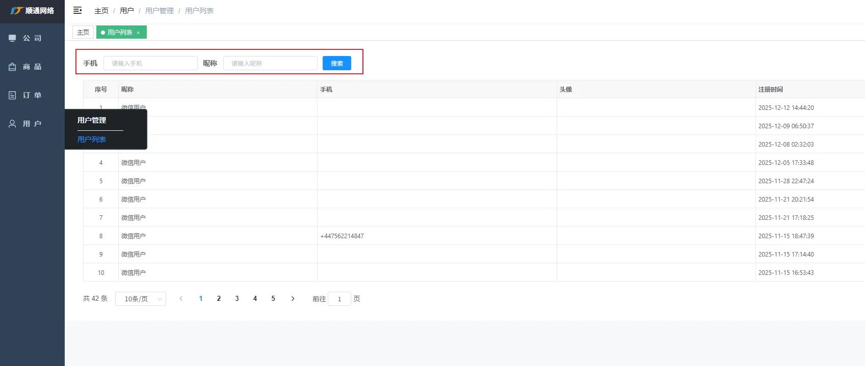 在用户列表页面,可以查询所用登录注册用户的信息,可以通过用户昵称或手机号查询