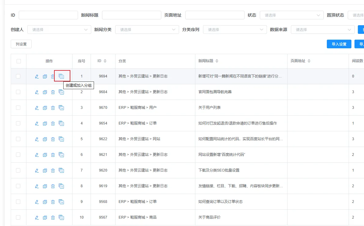点击操作栏的“创建分组”按钮