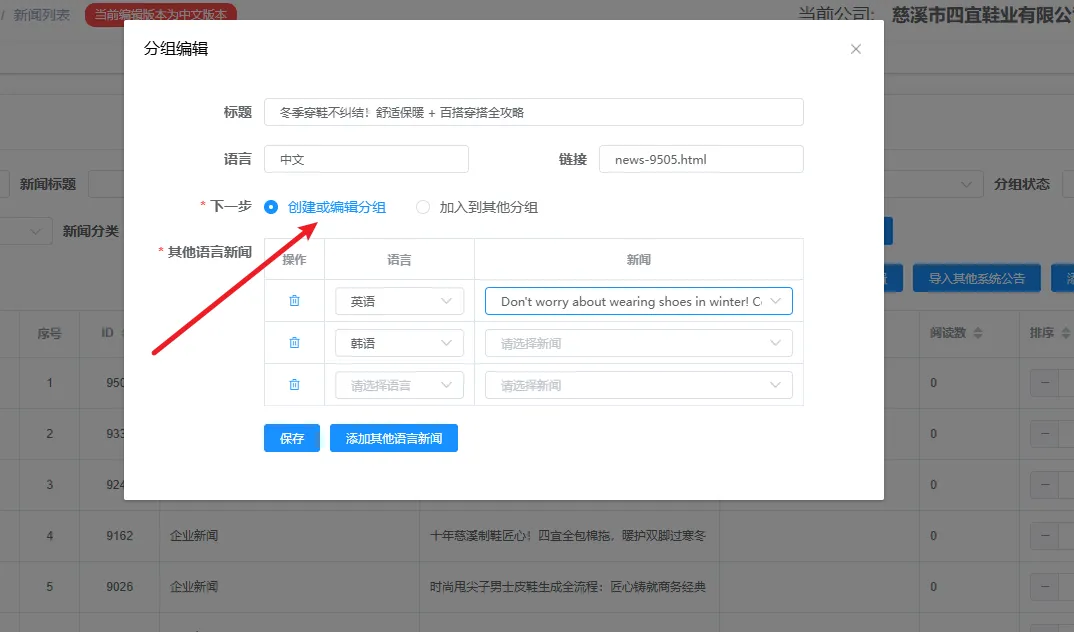 在跳出的弹窗选择语言和对应的链接,点击保存即可(也可对某一链接加入某一分组)