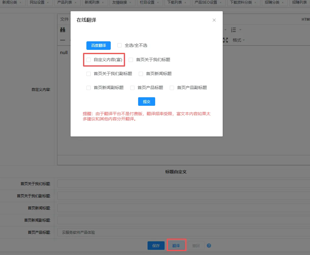 自定义板块设置可对自定义内容富文本进行翻译