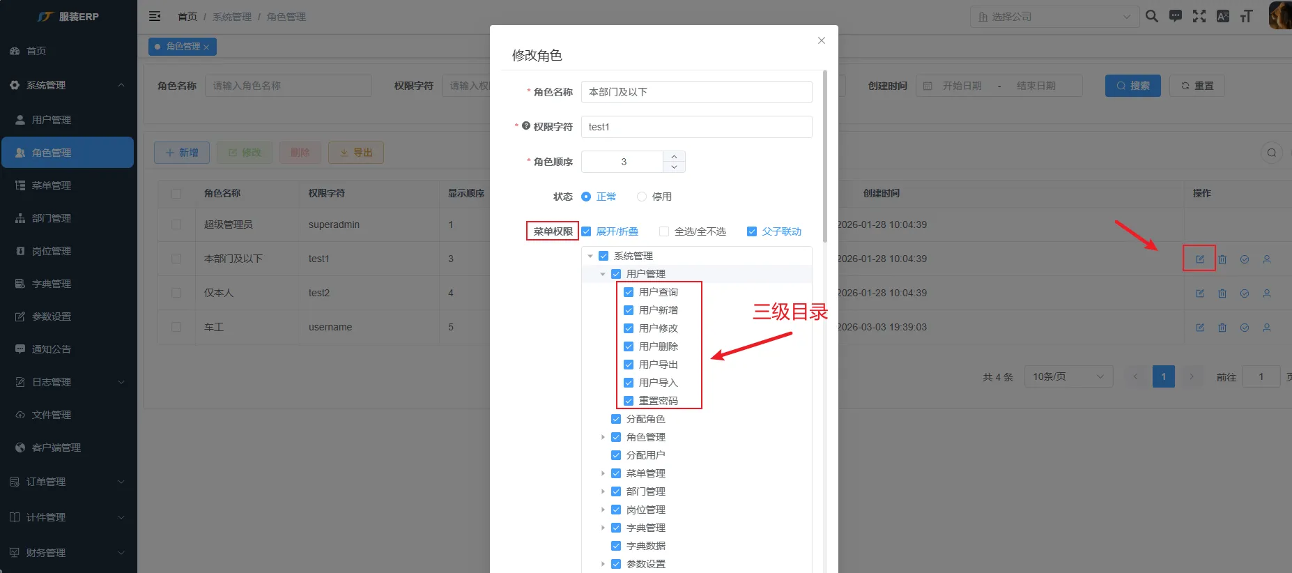 菜单权限->展开,可以显示所有二级目录,再展开三级目录,即可对具体的权限进行勾选。
