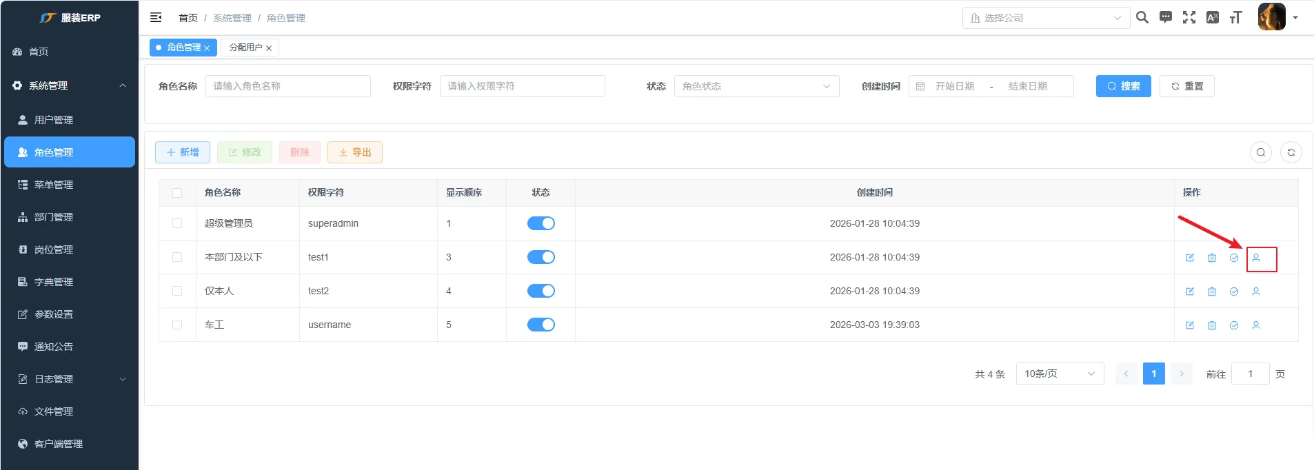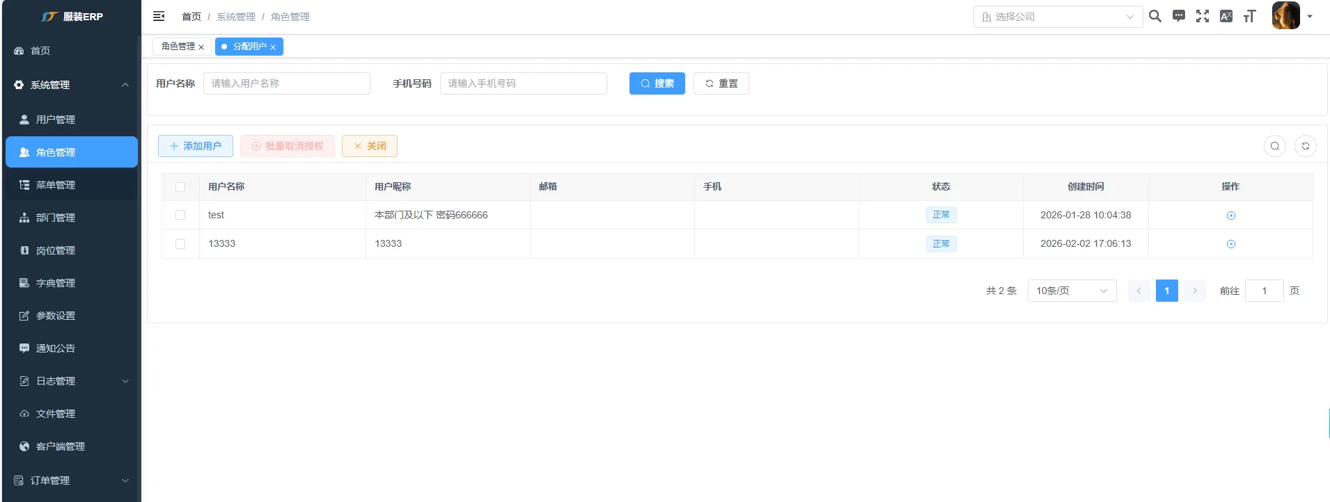 点击角色管理页面操作栏的分配用户按钮,进入“分配用户”页面注:分配用户仅可对已创建的用户进行分配,无法新建用户