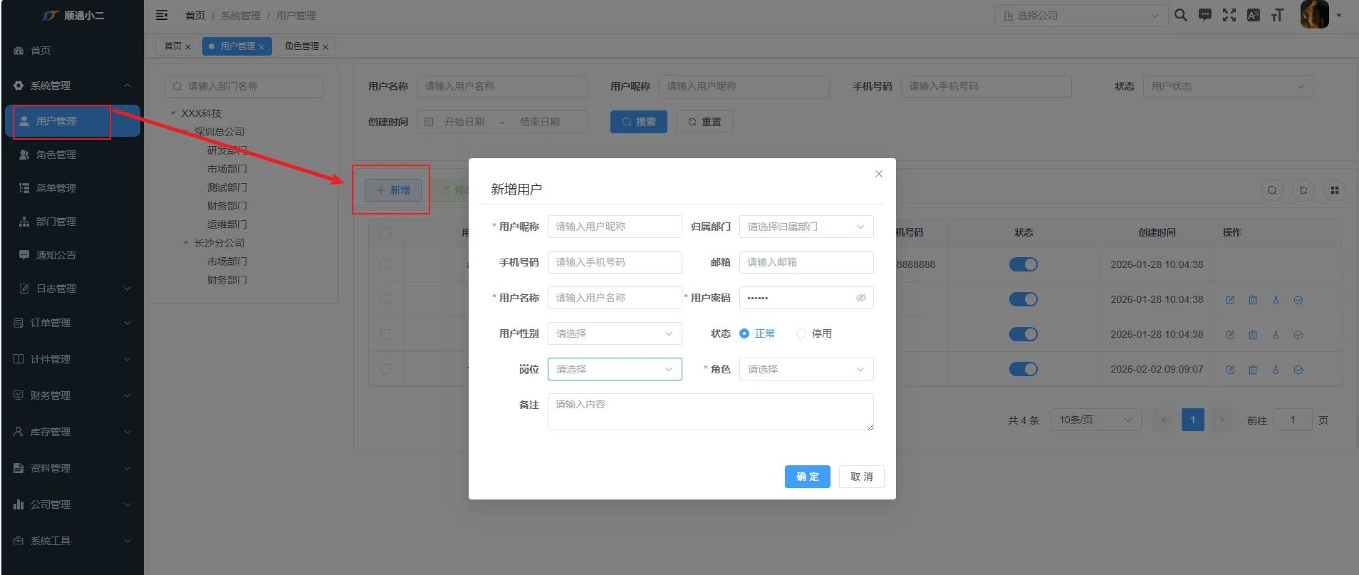 进入用户管理页面点击新增按钮跳出弹窗,输入有红色标志的必填项,点击确认即可新增成功搭配角色选项可以对单个用户赋予权限