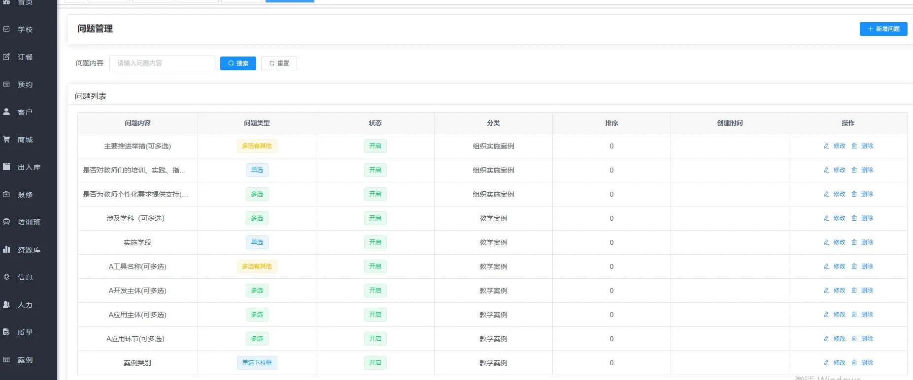 案例提交的表单字段和字段的选项都可在后台进行自定义,新增问题可以添加一个新的表单字段,点击新增/修改按钮跳出的弹窗可以设置字段的选项