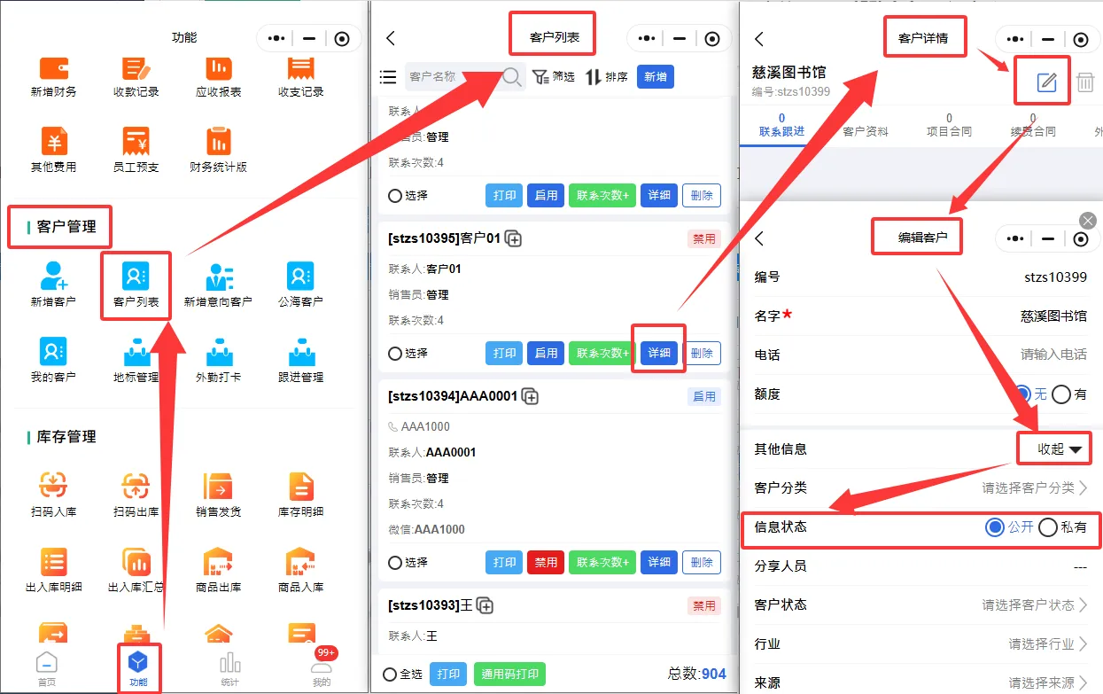 注意:公海客户只显示“客户列表”其他信息中信息状态设置为“公开”的用户。