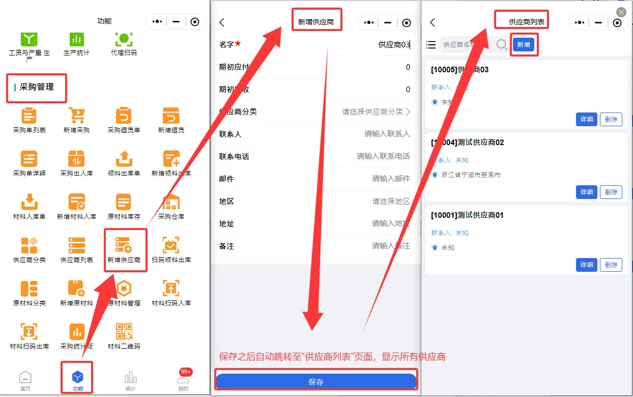 【功能】->在【采购管理】中选择“新增供应商”,可以新增供应商。注意:生成采购单以及材料报价时,供应商是必要的信息。