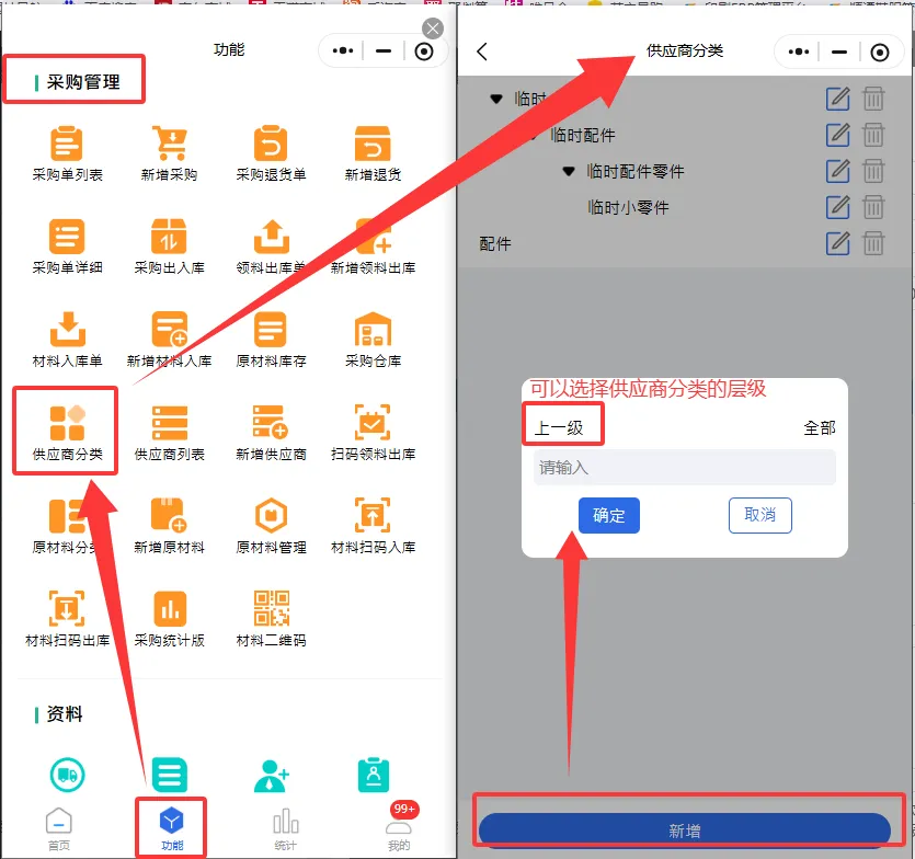 【功能】->在【采购管理】中找到“供应商分类”,新增、编辑、删除供应商分类,可设置供应商分类的层级。