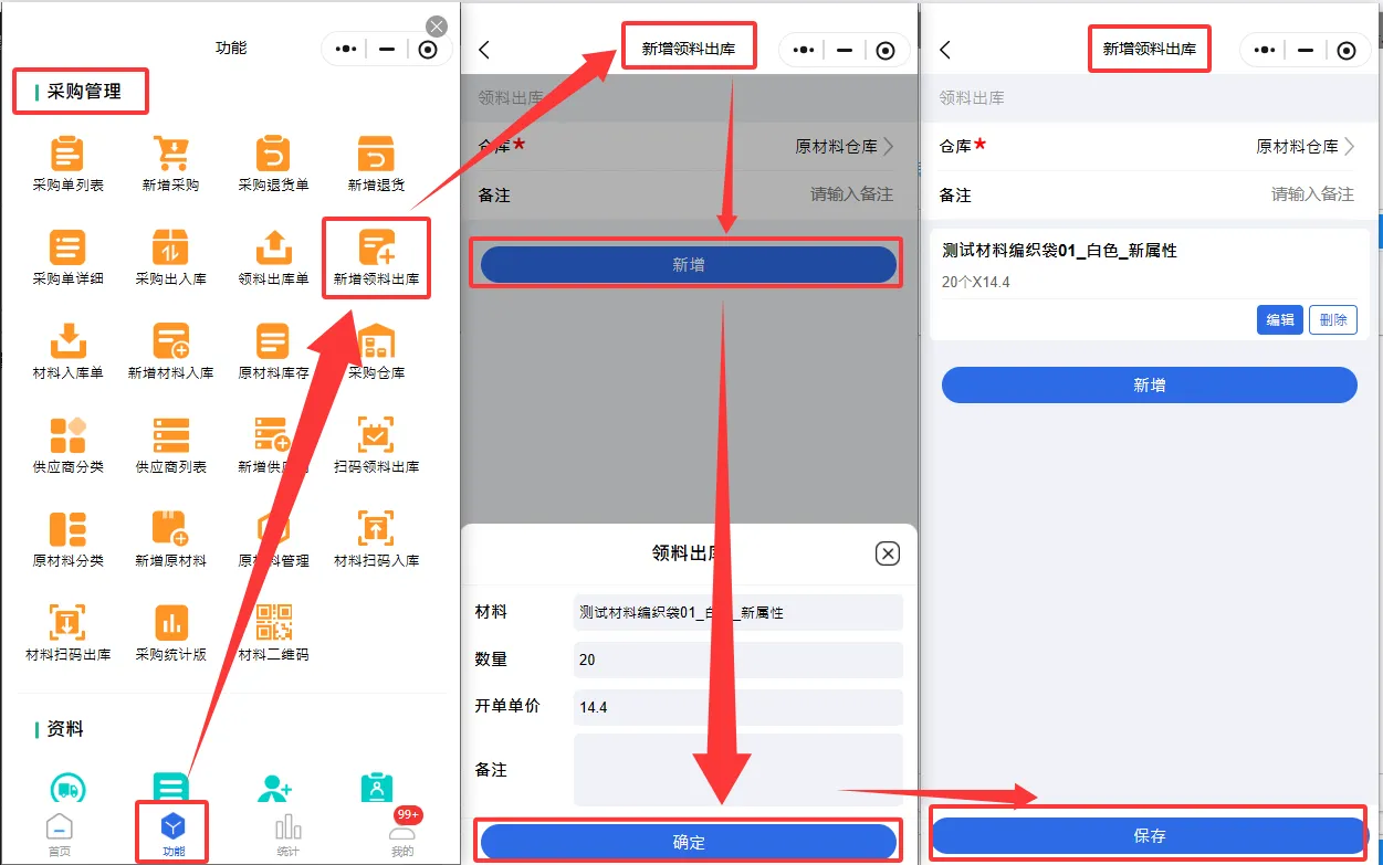 【功能】->在【采购管理】中找到“新增领料出库”,可以领料出库,手动出库材料。
