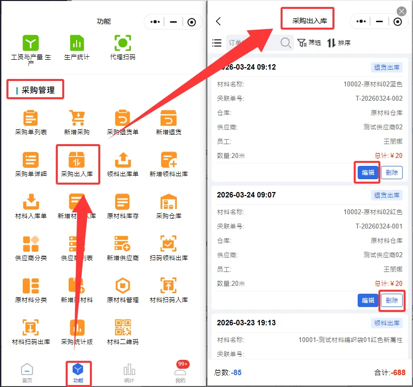 【功能】->在【采购管理】中找到“采购出入库”,可以查看采购出入库详情,编辑出入库数量,删除出入库记录。