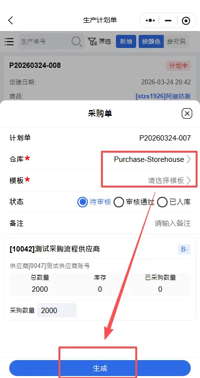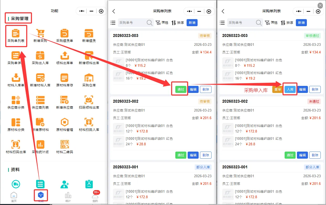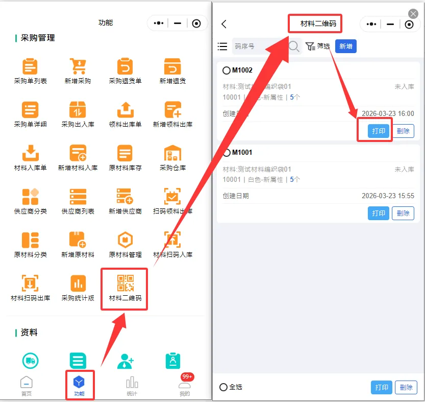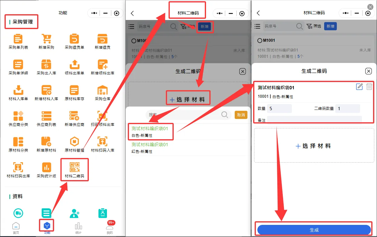 采购单入库/生成材料二维码。(生产计划单可直接领料出库)