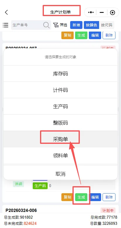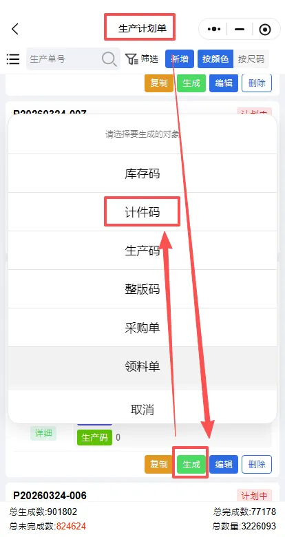 资料—生产计划单,直接生成计件码。计件码用于手机端扫码计件,只有拥有对应工序角色的账号能够扫码。